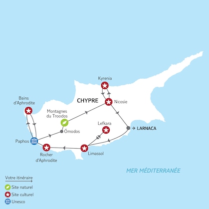L’île de l’amour…On raconte qu’Aphrodite, la déesse de l’Amour, y est née… A mi-chemin entre l’Orient et l’Occident, Chypre rayonne de ses trésors antiques, de ses criques romantiques et de ses paysages fabuleux : plages sablonneuses, collines majestueuses, montagnes boisées…